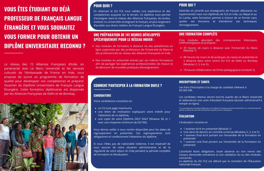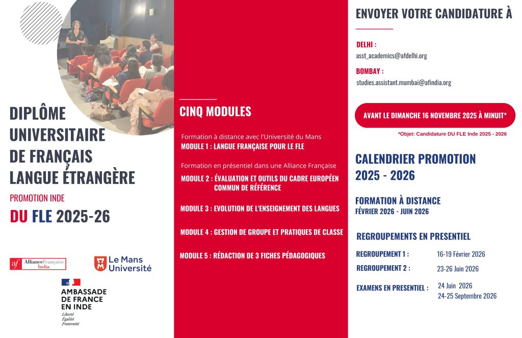 The Alliances Françaises d’Inde, in partnership with Le Mans University and the cultural services of the French Embassy in India, offer French teachers/professors a quality training program to develop your skills and prepare for the University Diploma in French as a Foreign Language exam DU-FLE 2025-2026 . A qualifying training course, which can be prepared at two centers: the Alliances Françaises of Delhi and Bombay.